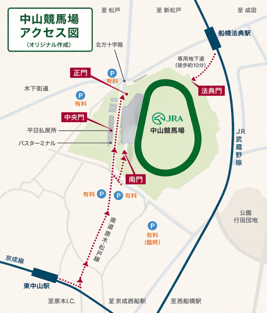 中山競馬場での現地観戦を 「迷わず、消耗せずに過ごす」 ための基本導線をまとめたものです。